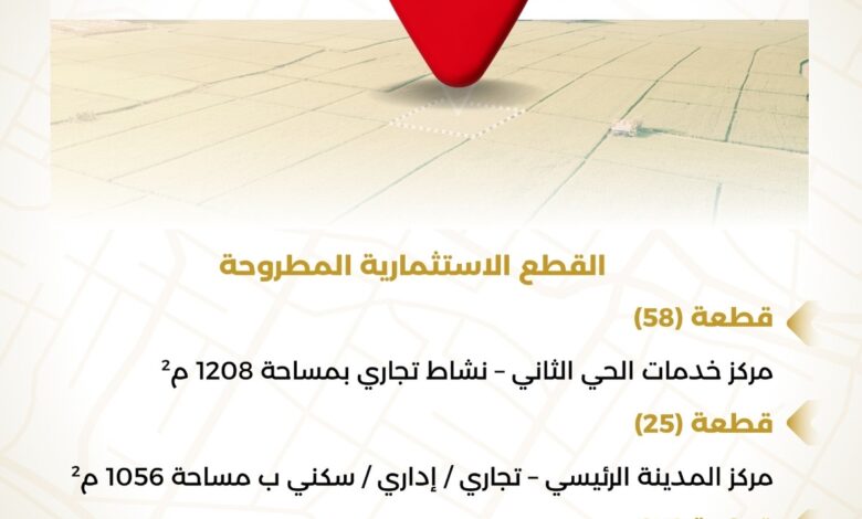 وأشار الجهاز إلى أن الطرح الحالي يشمل عددًا من القطع الاستثمارية، على النحو التالي: قطعة رقم (58) بمركز خدمات الحي الثاني، بنشاط تجاري، على مساحة 1208 م²، وقطعة رقم (25) بمركز المدينة الرئيسي، بنشاط تجاري – إداري – سكني، على مساحة 1056 م²، وقطعة رقم (14) بمركز الخدمات الرئيسي ومنطقة رجال الأعمال، بنشاط تجاري – إداري، على مساحة 2945 م²، والقطع أرقام (22 – 23) بمنطقة الورش بالتوسعات الجنوبية الغربية، بنشاط مركز خدمة وصيانة سيارات، على مساحة إجمالية 750 م²، بسعر متر 7,900 جنيهات.
